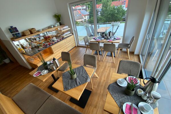 Morgens erwartet sie ein reichhaltiges Frühstückbuffet im charmanten Frühstücksraum oder bei schönem Wetter auf der Terrasse mit Blick auf das Hambacher Schloss und in die Rheinebene. Hier können Sie den Tag mit frischen regionalen Produkten beginnen, darunter knusprige Brötchen, frisches Obst und lokale Spezialitäten. Der Duft von frisch gebrühtem Kaffee erfüllt den Raum, während die ersten Sonnenstrahlen die Weinberge in goldenes Licht tauchen.